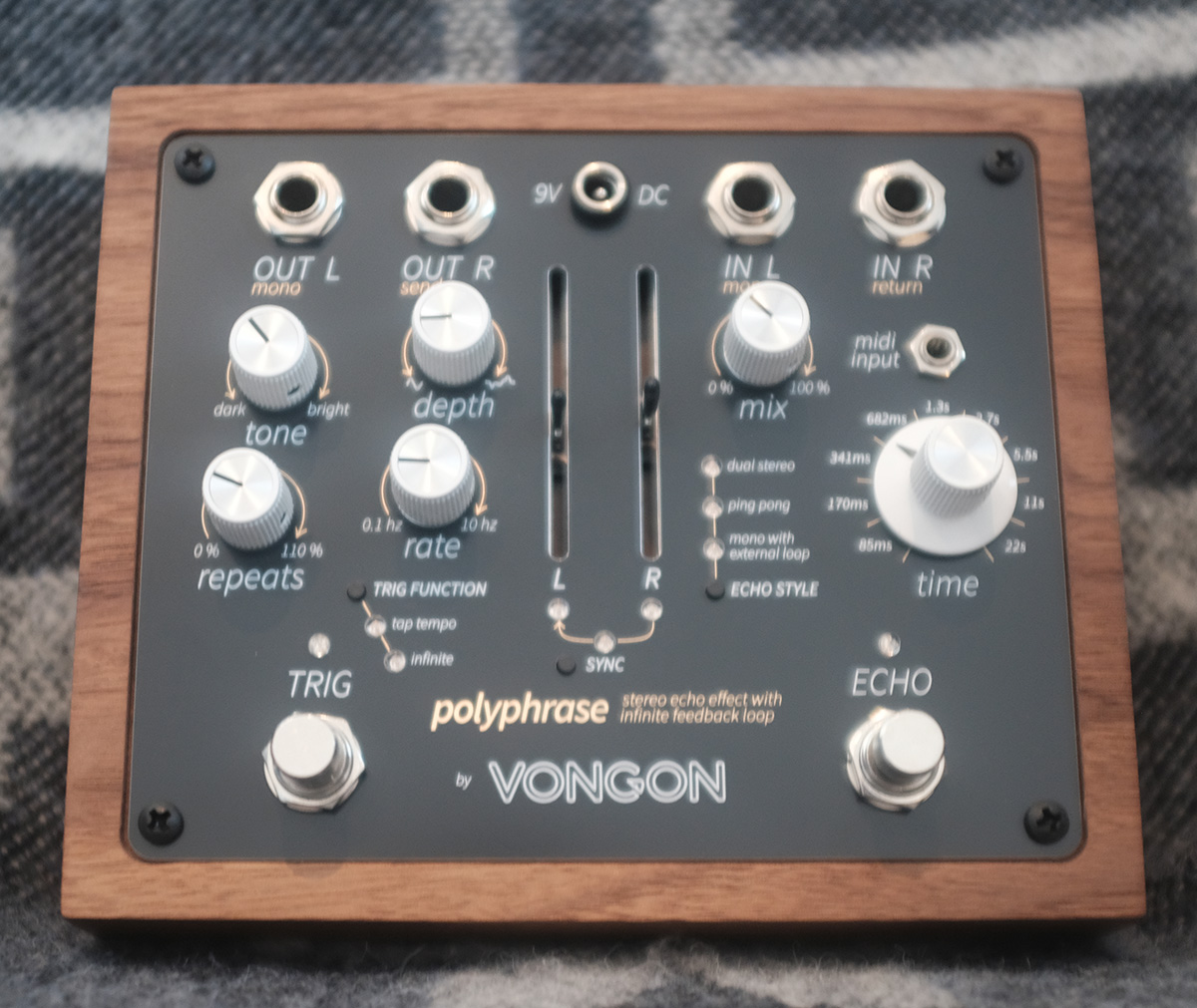 Alle disse kan videre kontrolleres med en rekke forskjellige justeringer som delay med inntil 22 sekunder, MIX, Tone, Depth og Rate. videre har du to trinnløse kontroller som lar deg justere Left og Right synkronisering.